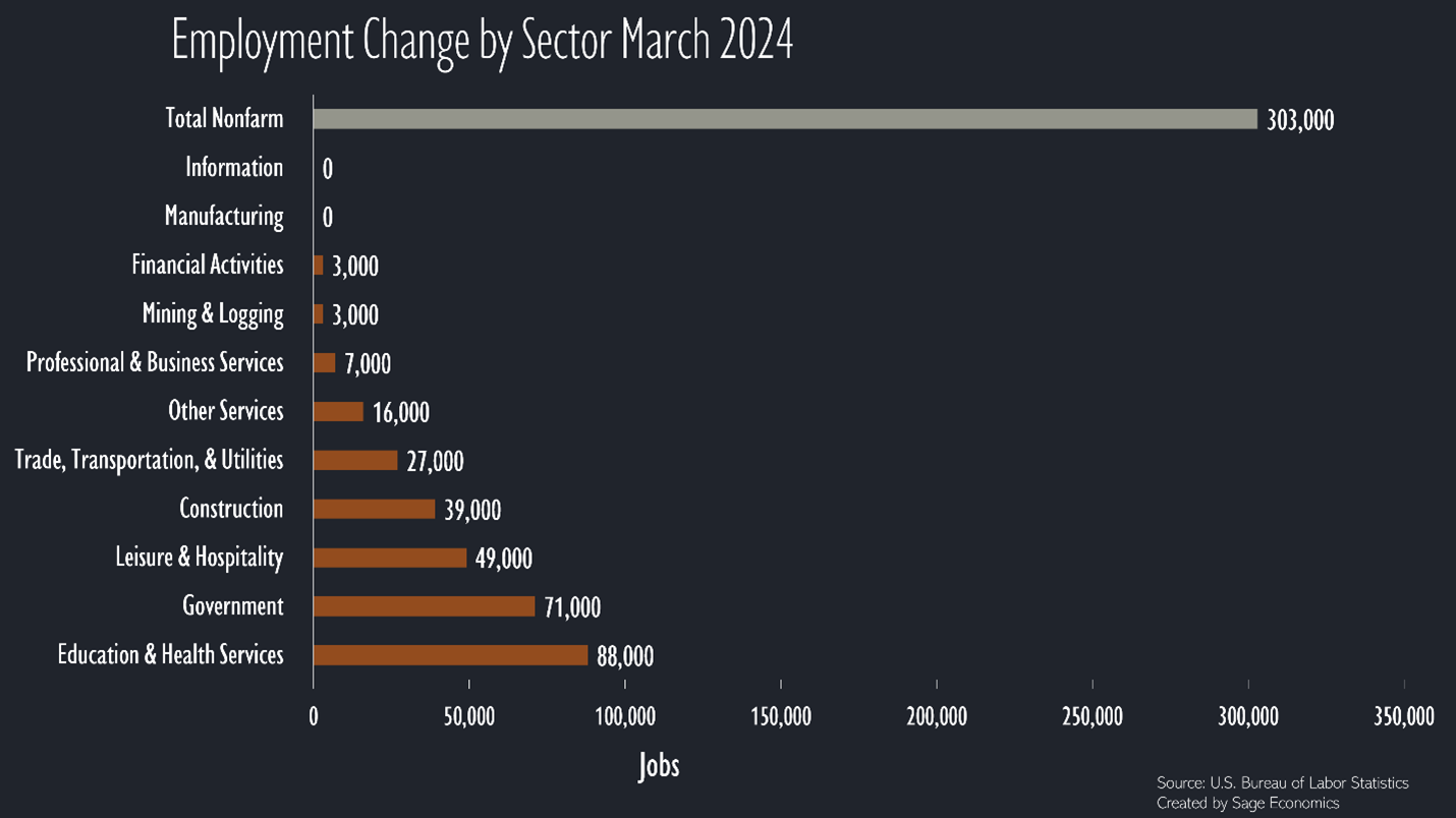 No industry lost jobs in March, though employment was unchanged in information and manufacturing.