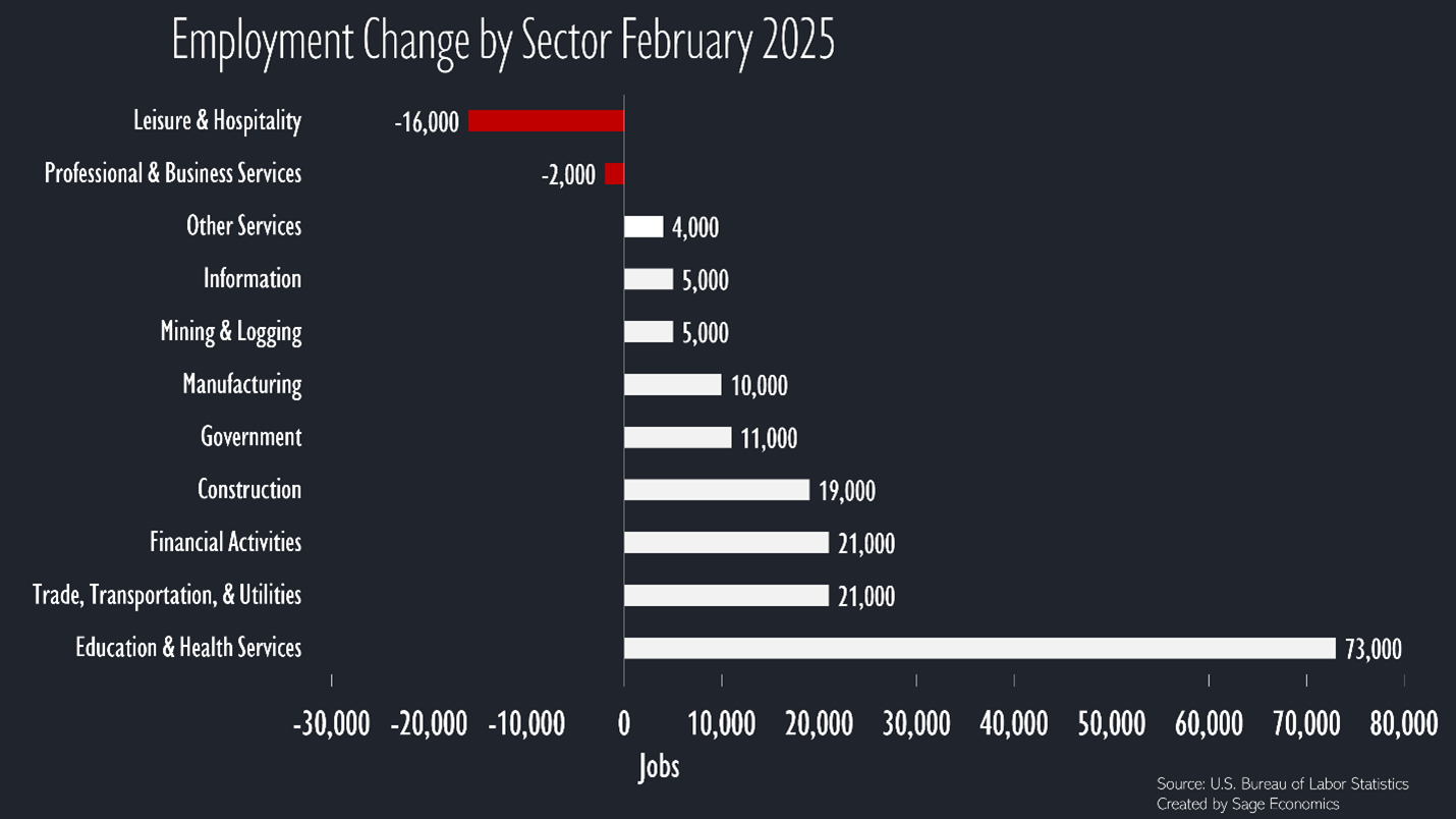 We might have seen some early signs of that in February with layoffs in a number of white collar segments—the kind that could be federal contractors affected by spending freezes—like professional, scientific, and technical services, legal services, computer systems design, and a couple others.