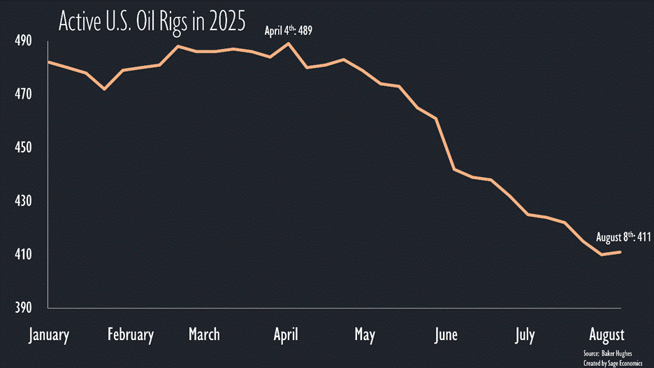 The streak is over! After 17 consecutive weekly declines, the number of active U.S. oil rigs finally increased. Granted, it only increased by one rig, rising from 410 during the last week of July to 411 during the first week of August, but if you’re an Orioles fan, you’ll take the one run (rig) win.