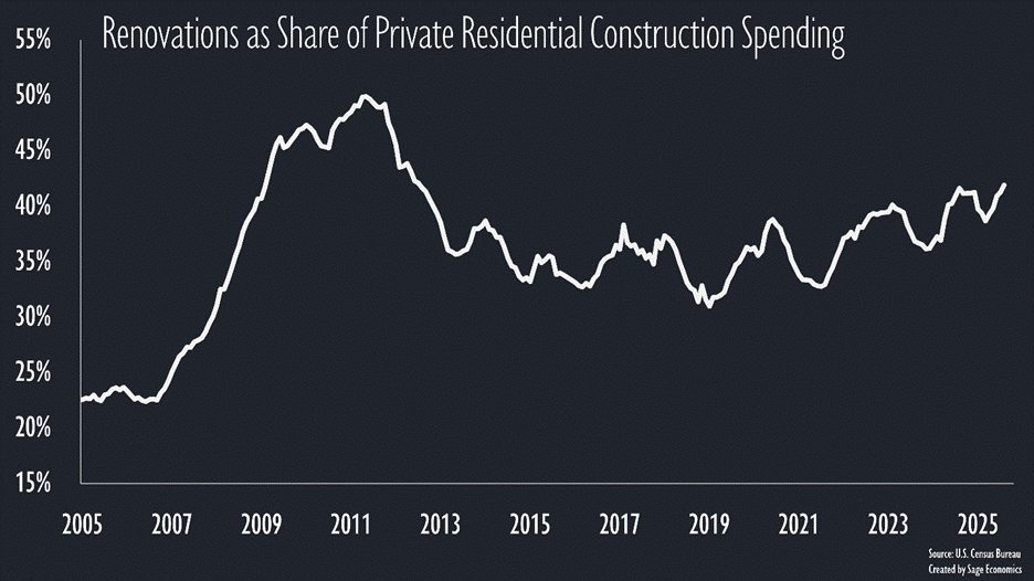 The recent rebound has been entirely due to repair/renovation work. New single and multifamily construction continues to contract. It’s reasonable to assume that high stock prices have at least partially funded big-ticket renovations among households with portfolios.