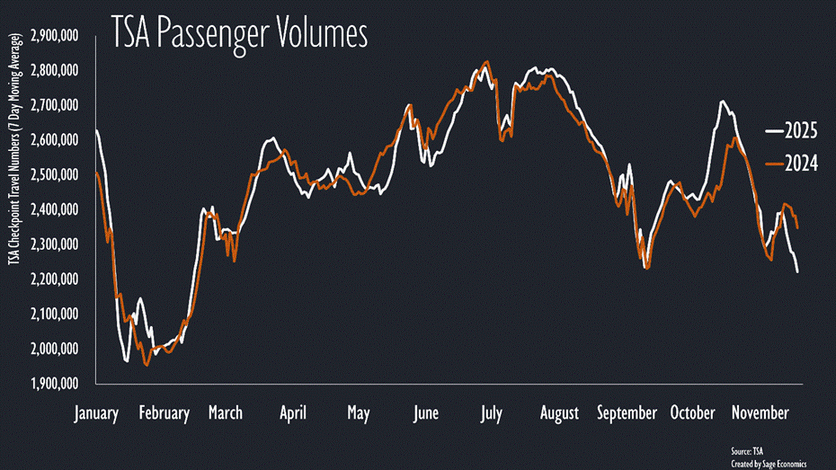 Air travel volumes have nosedived and are, according to TSA data, down more than 5% from 2024 levels during the week ending November 18th. Could this be due to the effects of the government shutdown and reduction in permissible flight activity? Definitely. But it’s still pretty concerning for those in leisure and hospitality since vacation plans may have changed during the shutdown, with more Americans opting for less expensive drive-to destinations as opposed to more expensive fly-to leisure hotspots.