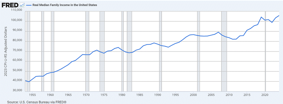 But that’s household income, which includes people who aren’t related. Median family income increased to $105,800, the highest level ever (yes, it’s adjusted for inflation). There are now more families earning over $200,000 a year than under $50,000 a year