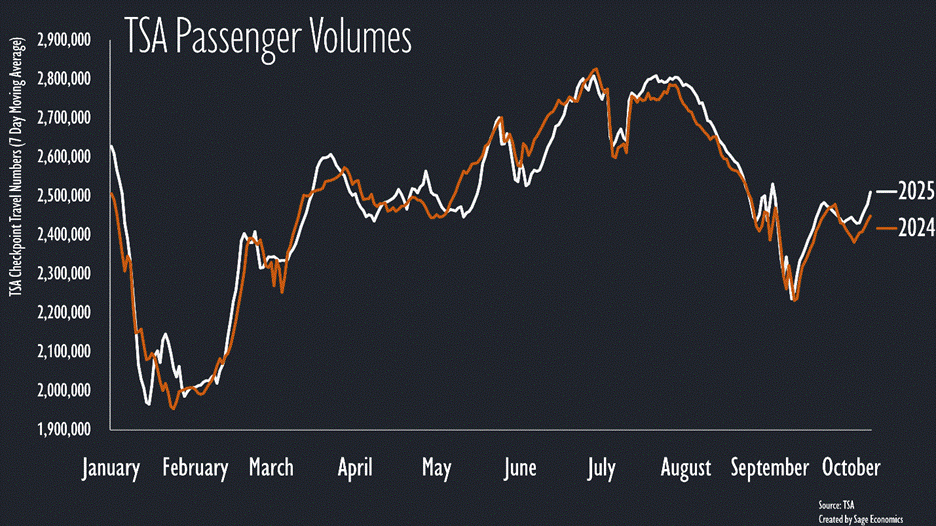 Travel volumes have held up remarkably well, with weekly flyers up about 2.5% year over year. This is encouraging at a time when most parts of the economy are flying blind.