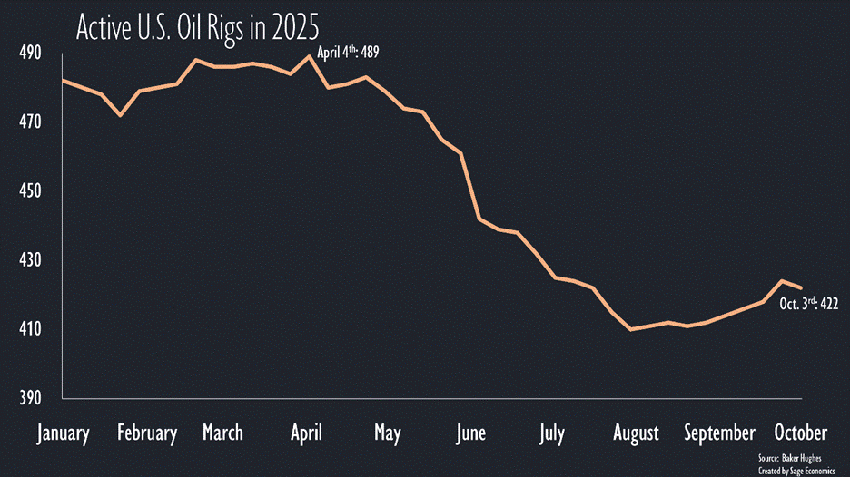 The number of active U.S. oil rigs fell, ending a streak of five consecutive weekly increases. Rig counts are still significantly lower than in early April when the Liberation Day tariffs were announced.