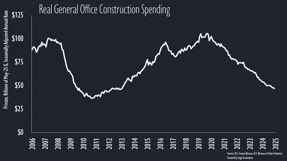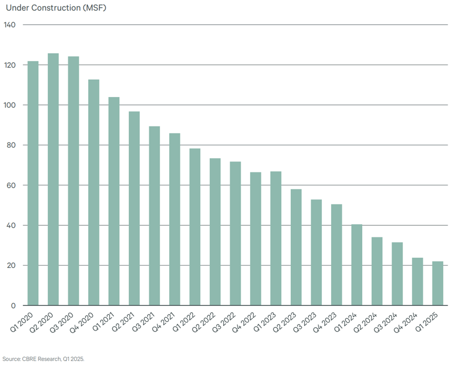 There’s been an even sharper decline in terms of new square footage being built, with just 22 million sq. ft. under construction in Q1 2025, according to CBRE. That’s down about 80% from early 2020 levels.