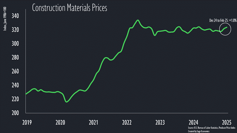 That period of well-behaved prices looks to be over. Materials prices are up 1.8% during the first two months of 2025 and, if that pace continues, will rise 9.0% for the year.