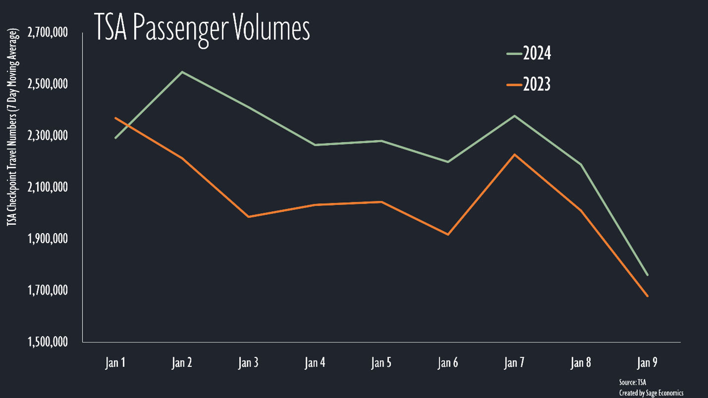 The number of travelers passing through TSA checkpoints has been 10% above 2023 levels through the first nine days of 2024. The most exciting part here is that after several years of having to compare data to 2019 due to pandemic impacts, we can finally look at this on a year-over-year basis. We’re back baby!!!