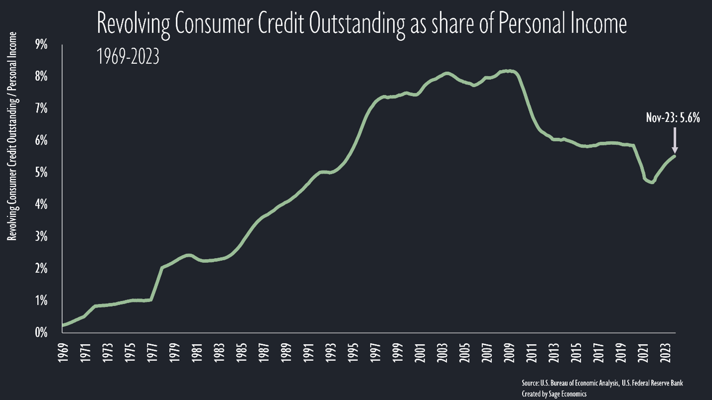 If you’re not, note that revolving consumer credit as a share of personal income currently stands at 5.6%, which is lower than at any point between the start of the pandemic (5.8%) and the mid-1990s. Which is to say, the trend is certainly not ideal, but credit card debt as a fraction of personal income is still low by pre-pandemic standards.