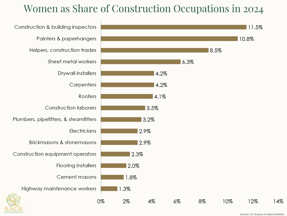 The share of women in actual construction occupations, while rising, was just 4.3% in 2024. For most trades, it’s actually below 3%, though women do account for a higher share of painters and construction and building inspectors.