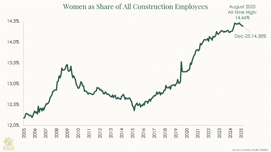 Women accounted for 12,000 of the 14,000 construction jobs gained in 2025. In August, their share of the industry’s workforce reached a record high of 14.46%.