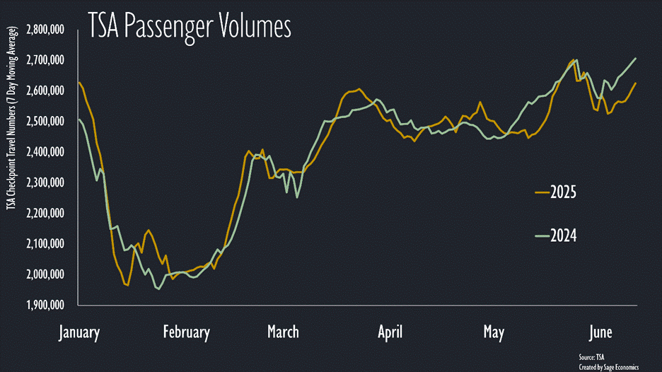 The summer travel season is off to a bad start, with TSA travel numbers down more than 3% compared to last year. The question is whether this is due to less international tourism (Canadians are really, really mad), fewer business travelers, or weak consumer demand, and the answer is probably some combination of all three. No matter the reason, this is not an especially good sign.