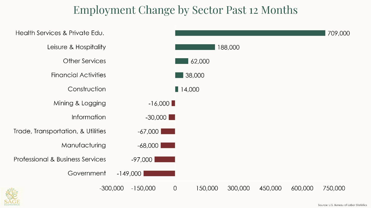 Overall, 2025 was a dismal year for employment growth, as you can see below, and the economy would have lost jobs were it not for the scorching hot and utterly noncyclical healthcare sector.