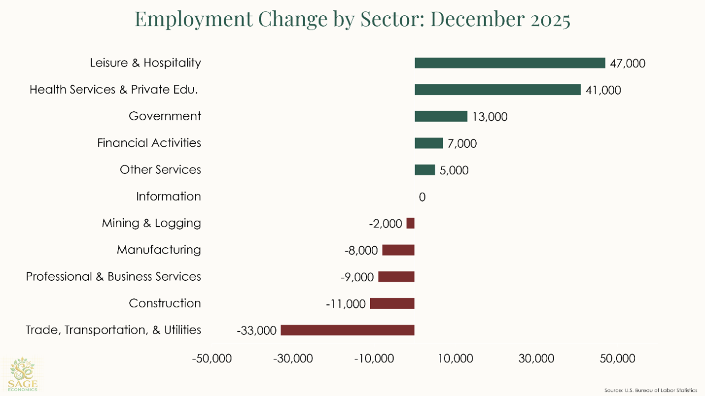 Industry dynamics remained pretty much unchanged in December, with momentum confined to healthcare, private education, and leisure and hospitality. Half of the major industry sectors lost jobs for the month, and it was a particularly difficult month for construction and trade, transportation, and utilities.