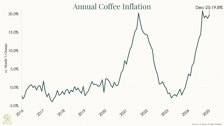 As a final note, coffee prices continue to soar and, after rising another 1.9% in December, are up a punishing 20% year over year.