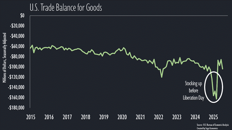It improved markedly in April, which reflects both Liberation Day and the fact that many imports were moved forward to the year’s first quarter. As of July, the monthly trade deficit is back to where it was at the end of 2024.