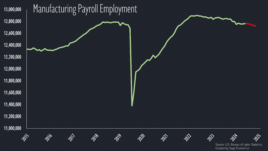 Zooming in to the past 10 years: we actually started losing manufacturing jobs (again) in early 2023. Have losses picked up since Liberation Day (the part in red)? Maybe a little. We’re down 42,000 manufacturing jobs over the past five months.