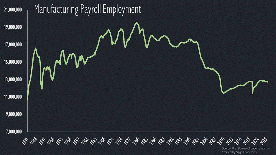 U.S. manufacturing employment peaked in 1979 and has been generally falling ever since. This isn’t just the outsourcing of production. Modern factories just require significantly fewer workers.