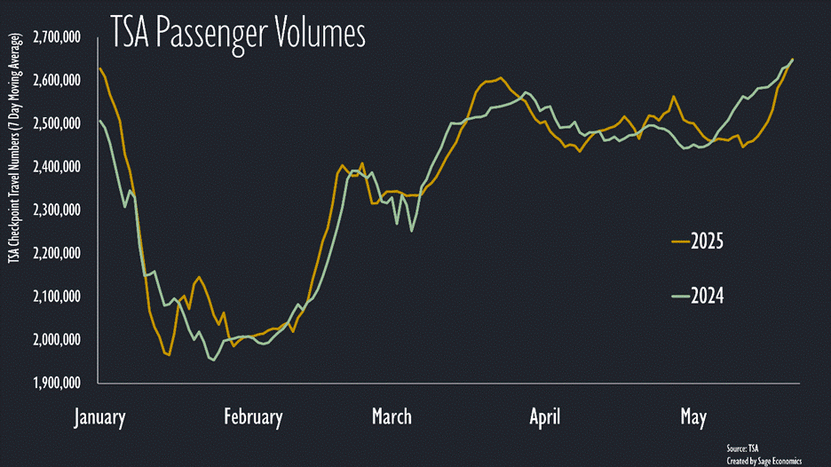 Air travel bounced back over the past week, according to TSA data, and travel volumes are now right back in line with 2024 levels. Memorial Day weekend could give us an early indication of how many people will be traveling this summer.