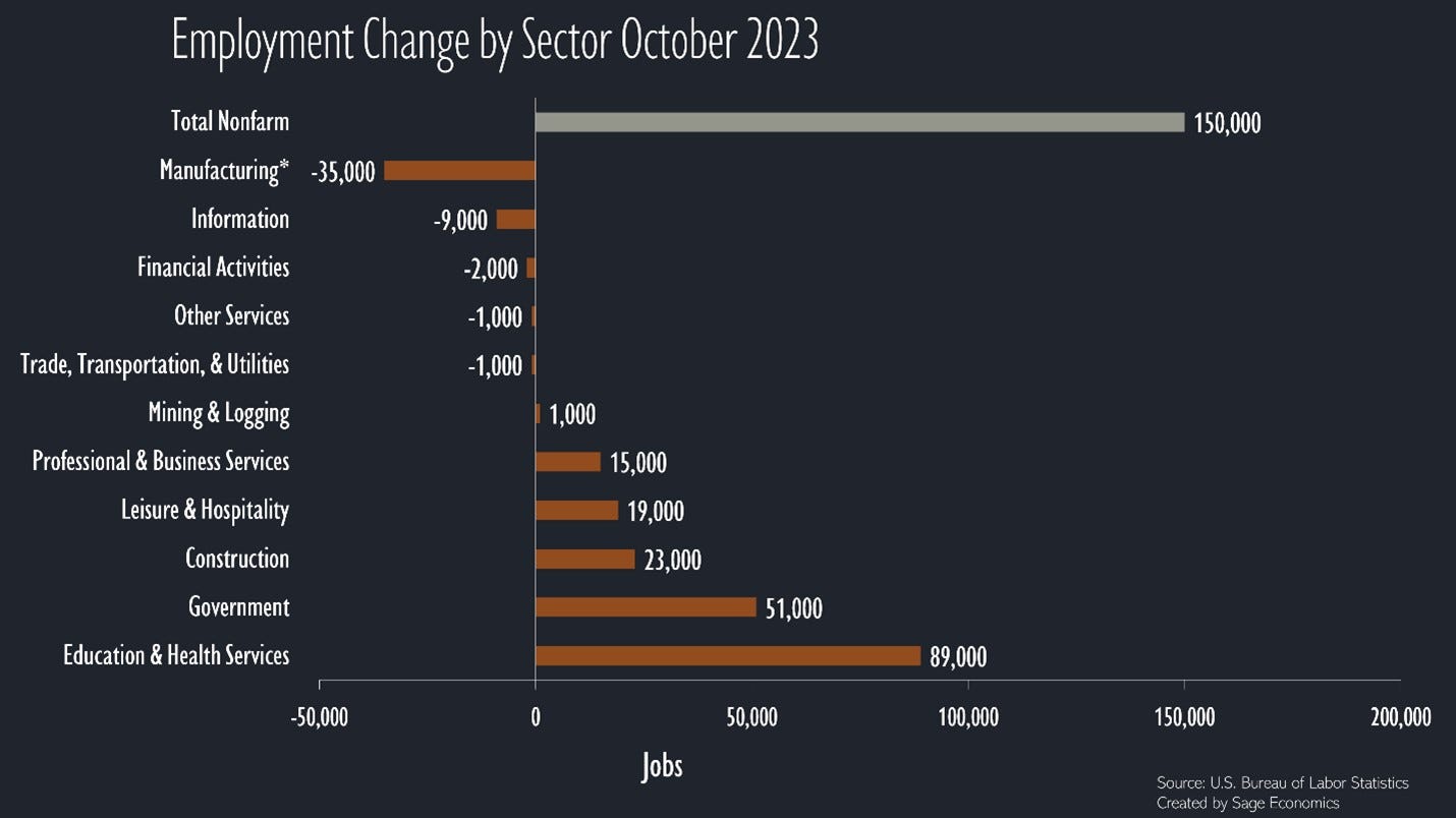 U.S. payroll employment increased by 150,000 in October. That’s fewer than forecasters expected, but the UAW strike probably subtracted about 30,000, and those will be back next month.