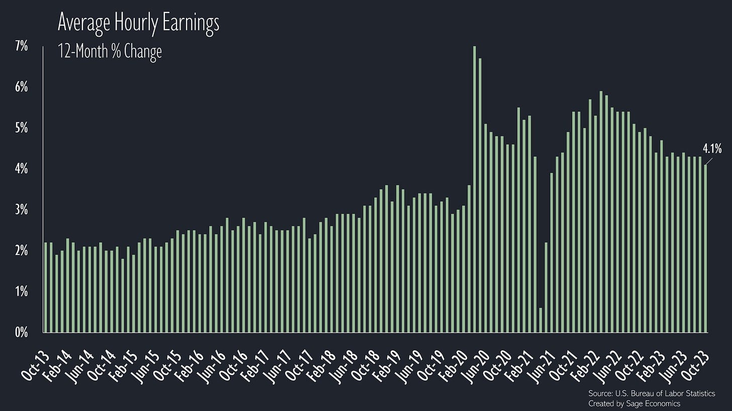 The Fed, which decided not to raise rates at their meeting earlier this week, will like what they see in today’s report. Why? Because slower job growth comes with slower wage growth; average hourly earnings rose just $0.07 (0.2%) in October, the smallest monthly increase in both absolute and percentage terms since February 2022. Over the past year, earnings are up 4.1%. That’s still way too fast to get inflation back to the Fed’s 2% target, but it’s trending in the right direction.