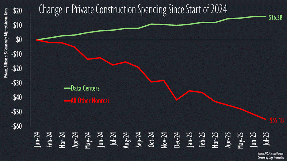 Critically, this has come at a time when virtually every other subsegment is struggling. Since the start of 2024, spending on data centers has risen by $16 billion, while spending on every other private nonresidential segment has fallen by $55 billion.