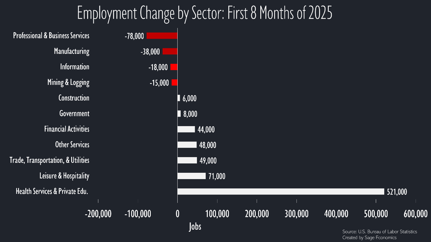 Looking at year-to-date employment change, the healthcare outperformance is even more glaring.
