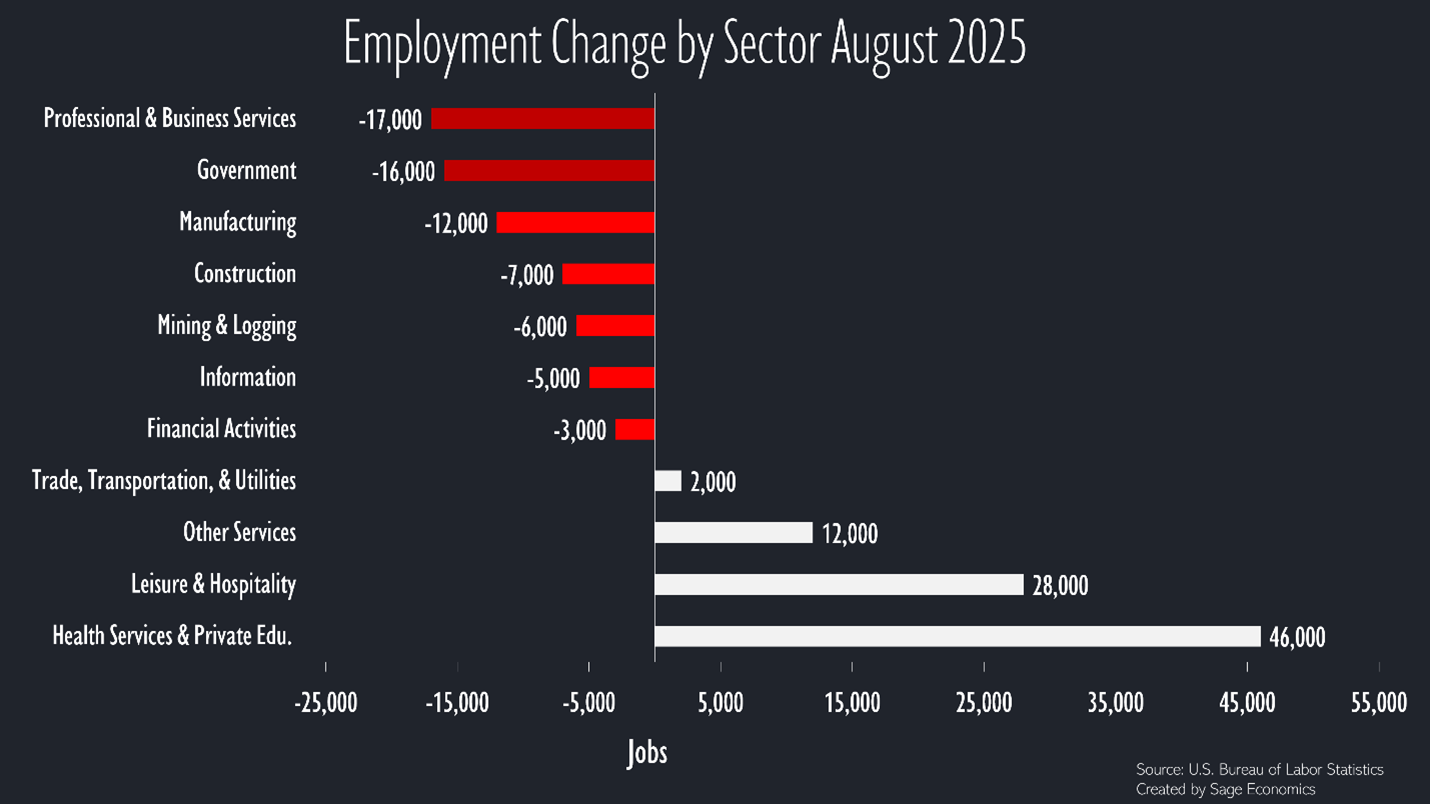 7 of the 11 major industry groups lost jobs in August. Manufacturing, which is supposed to be the primary beneficiary of tariffs, has now lost 42,000 jobs since April.