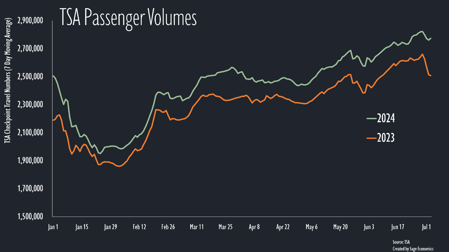 People keep traveling like crazy according to TSA data. Travel volumes usually fall off toward the end of June and start of July, but that hasn’t been the case this year.