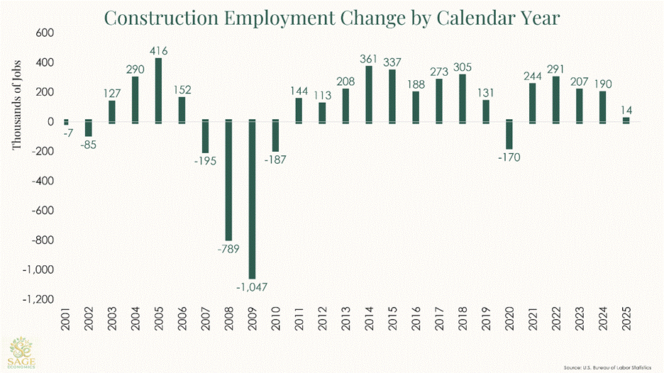 The construction industry added just 14,000 jobs in 2025. Excluding 2020, that’s the worst year for construction employment since the Great Recession in 2010.