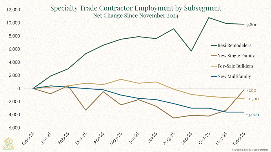 As you can see below, remodeling employment has actually held up pretty well over the past year, with losses concentrated in the new residential STC subsegments (data by subsegment lags by a month, so this is Nov-24 to Nov-25).