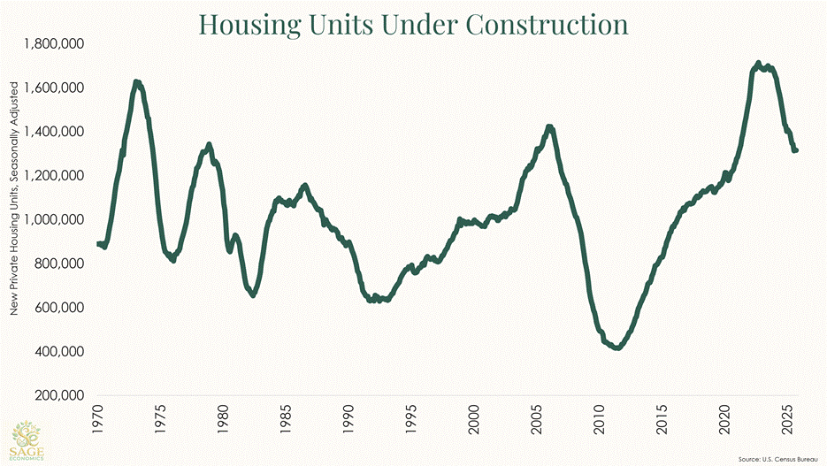 The cause here is pretty simple: the number of new homes under construction has fallen sharply from the 2022-23 historical peak.