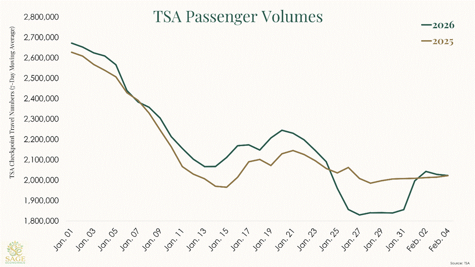This last winter storm put a freeze on air travel, according to TSA data, but it’s bounced back since. Air travel volumes were unchanged on a year-over-year basis for the week ending February 4th.
