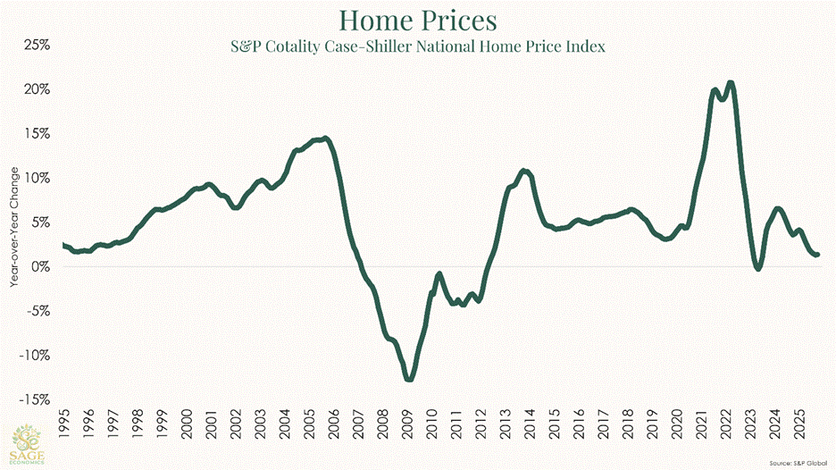 Home prices rose just 1.36% from October 2024 to October 2025. That’s the smallest year-over-year increase in more than two years. With inventory levels at their highest since 2019 and rising, housing price growth should remain tame over the next few quarters. Many regions have experienced recent declines in home sales prices.