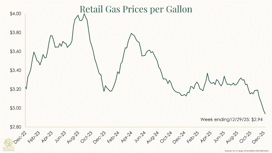 Gas prices fell to an average of $2.94/gallon during the last week of the year. This is cheap and should give consumers a little boost heading into the new year.