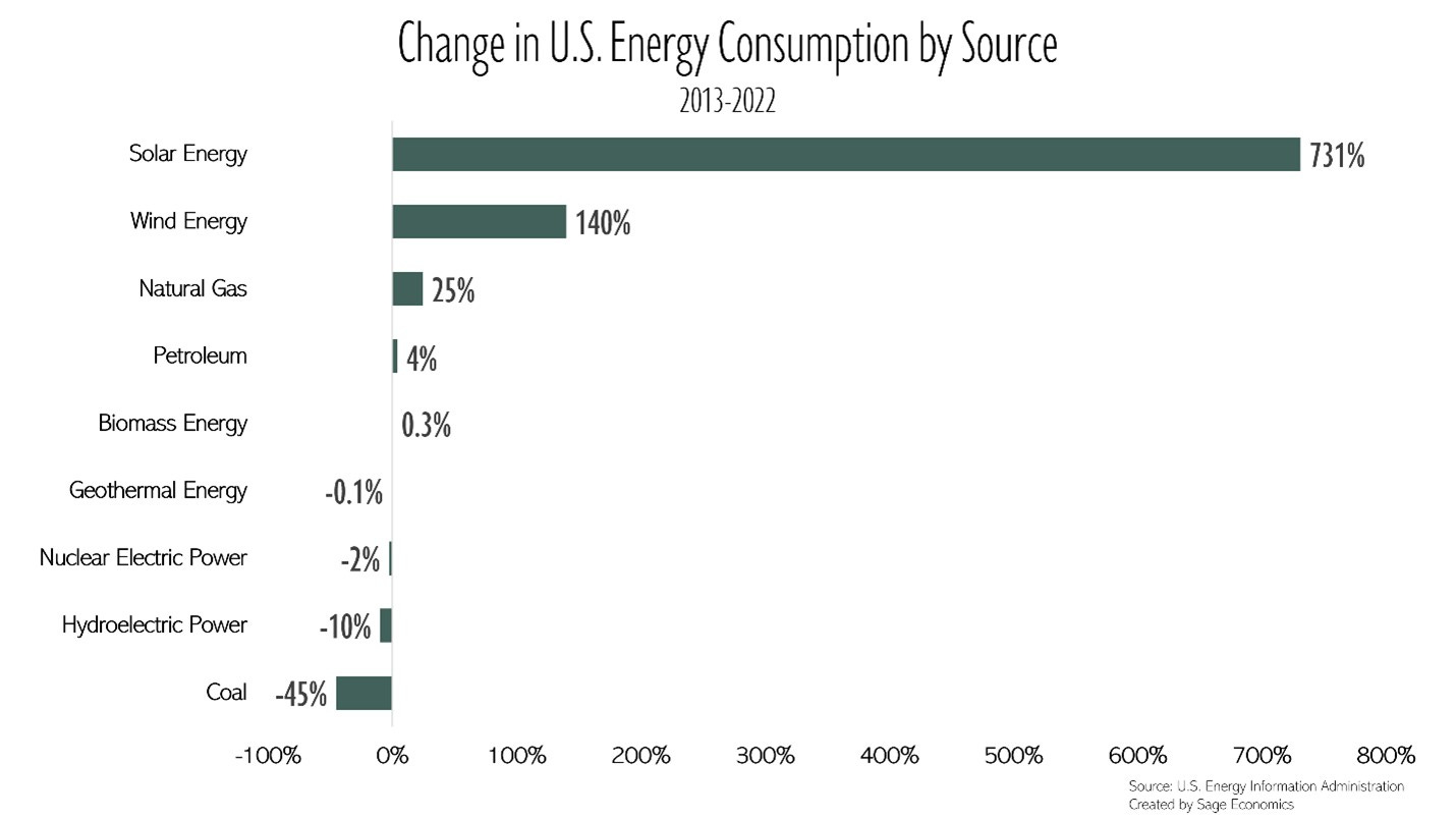 Over the past decade, U.S. consumption of solar energy and wind energy has increased by 731% and 140%, respectively, while consumption of coal decreased by 45%. As production of these technologies ramp up, costs will fall, making adoption more financially feasible.