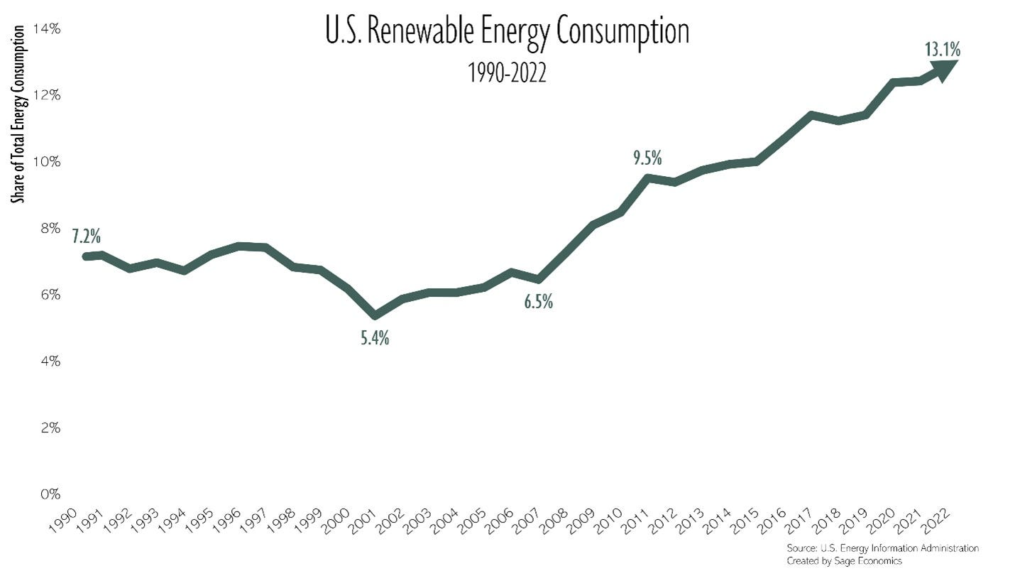 The share of U.S. energy consumption that comes from renewable energy sources has steadily increased over the past two decades, from a low of 5.4% in 2001 to 13.1% in 2022. Renewable energy sources accounted for nearly 20% of utility-scale electricity production in 2021.