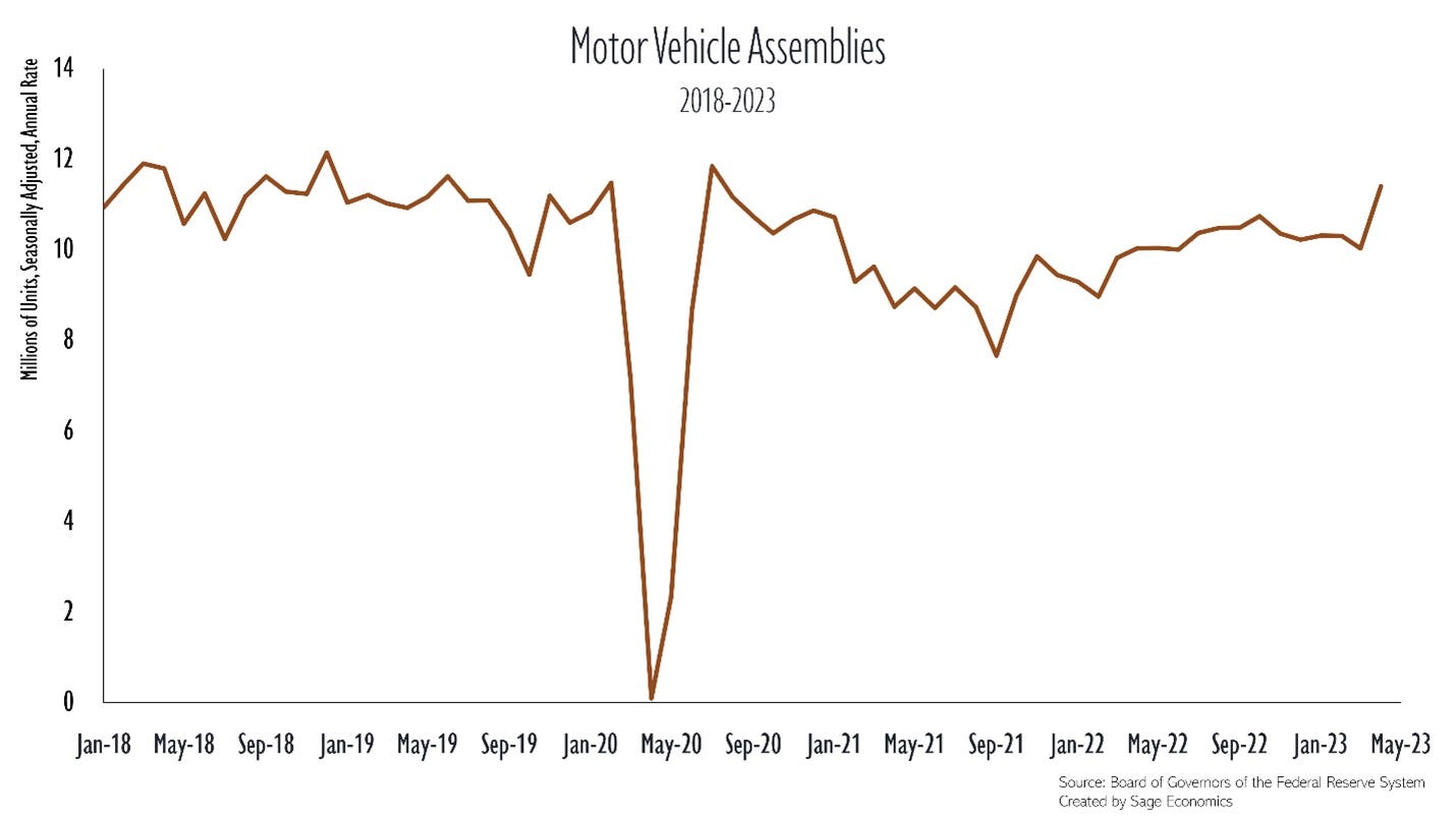 Motor vehicle assemblies (the number of new cars made) surged to 11.4 million in April, the most in any month since July 2020 and up 13.7% from March. This increase comes after assemblies fell by nearly 7% from October 2022 to March of this year and signals that supply chains—specifically for semiconductors—are improving.
