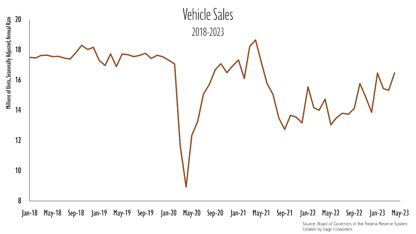 There were more new vehicles sold in April than in any month since May 2021. Throughout the pandemic, there were about 2-3 million fewer vehicles sold per year compared to the late 2010s. That suggests that there’s a lot of pent up demand from buyers who delayed car purchases due to low inventory levels. As vehicle assembly rates and supply chains improve, it’s very possible that the upward trend in vehicle sales continues even absent lower interest rates.