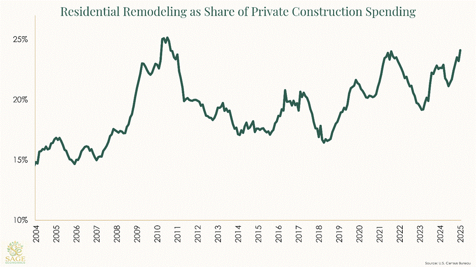 It also makes sense that finishing carpenters, painters, and floorers are adding jobs. While residential construction activity has been slowing, remodeling work has actually gained steam over the past year and currently accounts for the highest share of private activity since 2011.