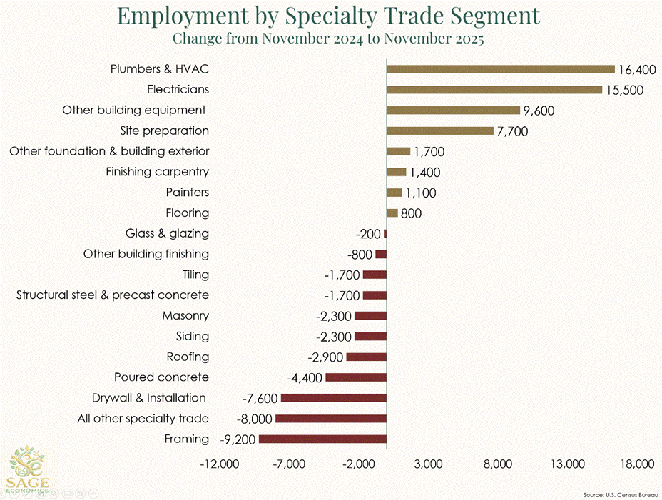 The trades that have lost jobs over the past year, like framers, concrete pourers, drywallers, siders, and roofers, make a lot of sense. These are primarily involved in new construction, specifically on the residential side. The slowdown in new housing construction has clearly hit them hard.