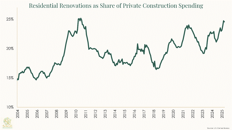 To put this into context, we’re spending about 770% more on residential renovations than we are on data centers. Residential renovations now account for $1 in every $4 of private construction activity.