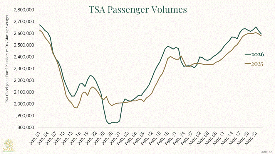 Air travel has held up better than I would have guessed in the face of the TSA wait time craziness, with passenger volumes still up on a year-ago basis. Even with the end of this TSA funding standoff in sight, the prospect of rapidly rising fuel costs suggests ongoing turbulence for air travel.