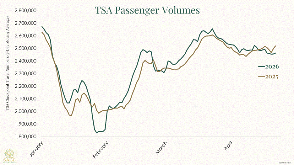 Air travel volumes have been below year-ago levels for more than a week. There’s still a chance that this just has to do with the timing of spring break, but given rising air fares and broader uncertainty, it wouldn’t be surprising if travel stays subdued over the next several weeks.