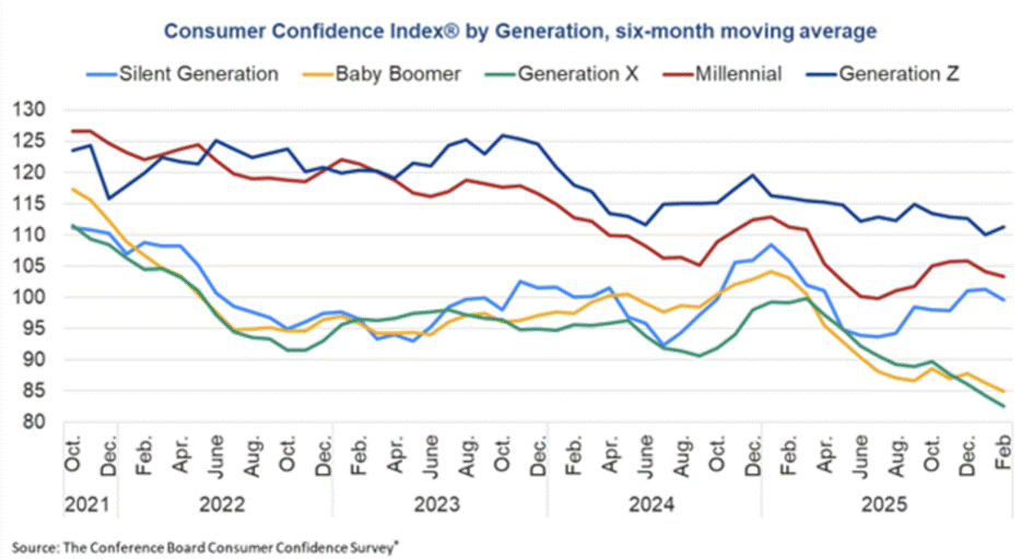 Consumer confidence improved slightly in February but is still down substantially from the November 2024 cyclical peak. Interestingly, Gen Z has the best sentiment over the past six months while Gen X has the worst.