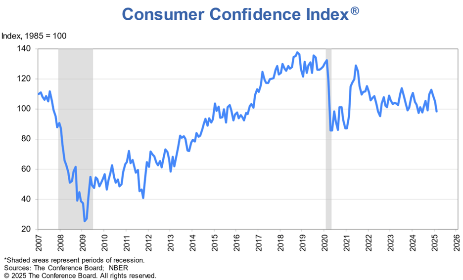 Consumer confidence plunged in February, posting the largest monthly decline in more than three years. Economic sentiment was great following the election but has since fallen off due to drastically increased uncertainty and stubborn inflation. Eggs and tariffs remain the talk of the town.