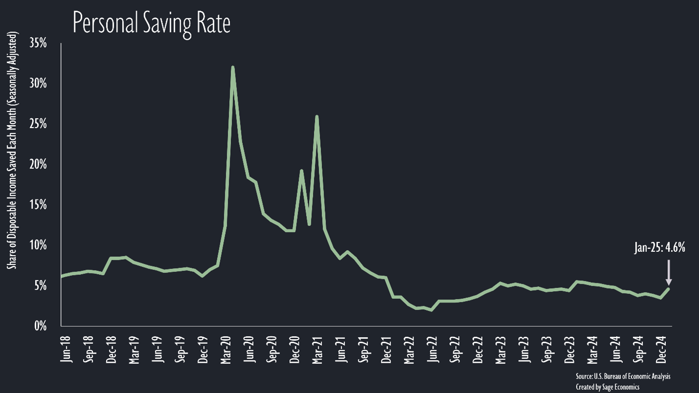 The savings rate jumped to 4.6% in January (that’s what happens when income rises and spending falls), the highest level since the first half of 2024.