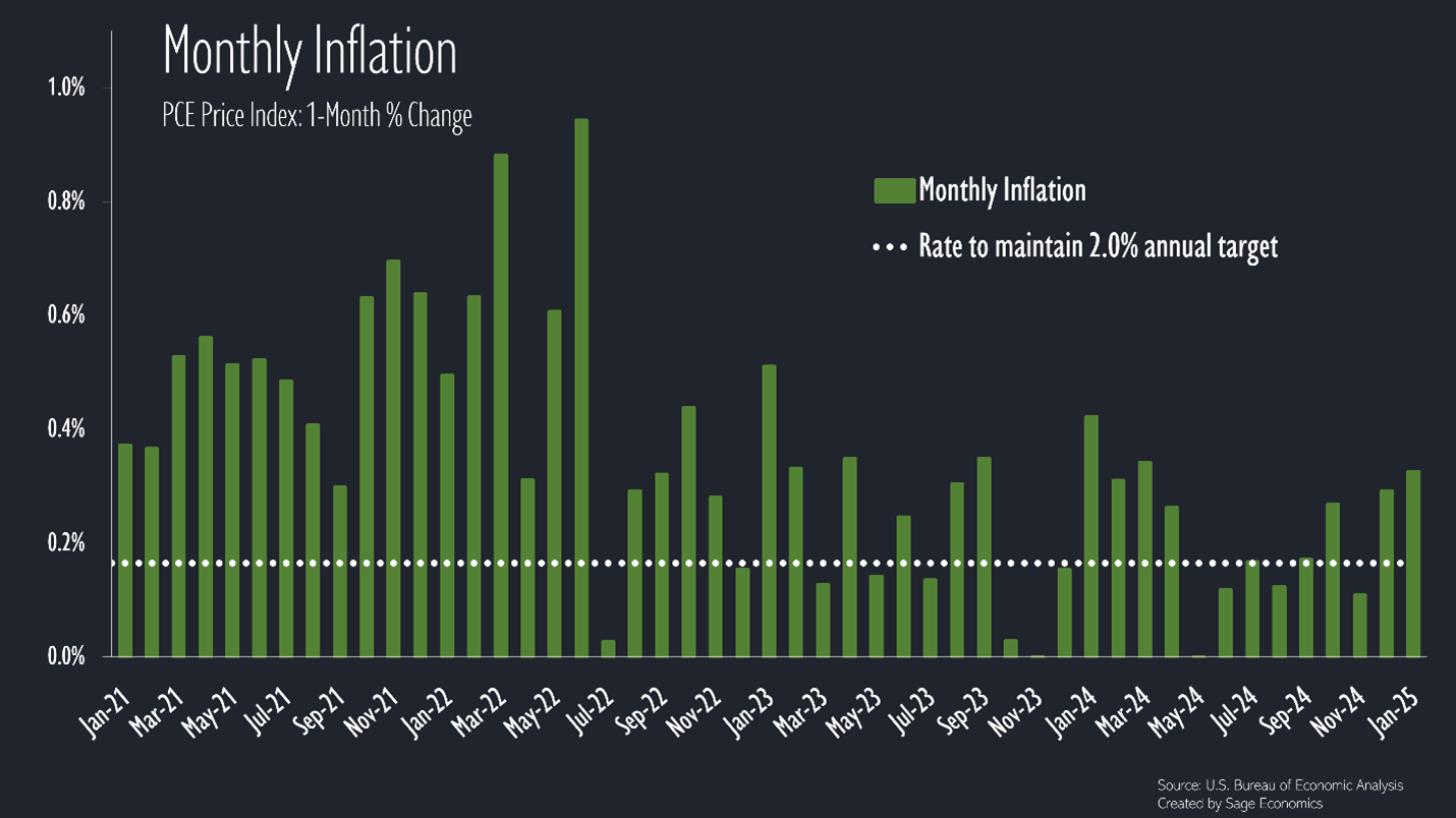 The Fed’s favorite measure of inflation increased pretty forcefully in January, rising at the fastest pace since March. The green bars need to stay below the white dotted line (on average) for inflation to return to a 2.0% annual rate. As you can see below, inflation has accelerated since October, and that’s before many of the tariffs under consideration go into effect (if they in fact do).
