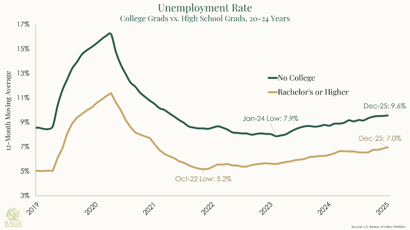 Of course, it’s not just young college graduates who can’t find jobs. The 20-24 year unemployment rate for those who never attended college has risen similarly.