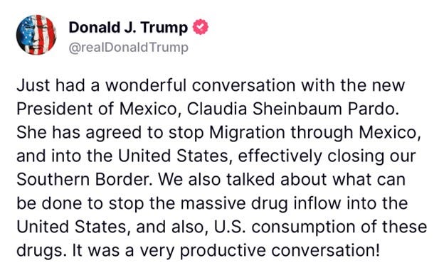On Tuesday, President elect Trump threatened 25% tariffs on all Mexican and Canadian imports. On Wednesday, we wrote that these tariffs probably wouldn’t be enacted, and on Wednesday night, Trump seemed to back off this specific threat (at least on Mexico).