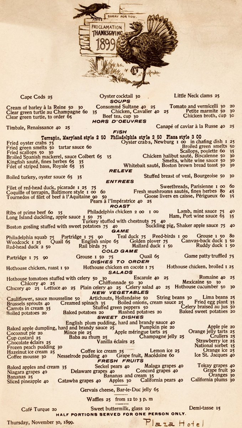 Check out this menu from the Plaza Hotel’s Thanksgiving dinner in 1899. Those prices? They’re in cents, not dollars.